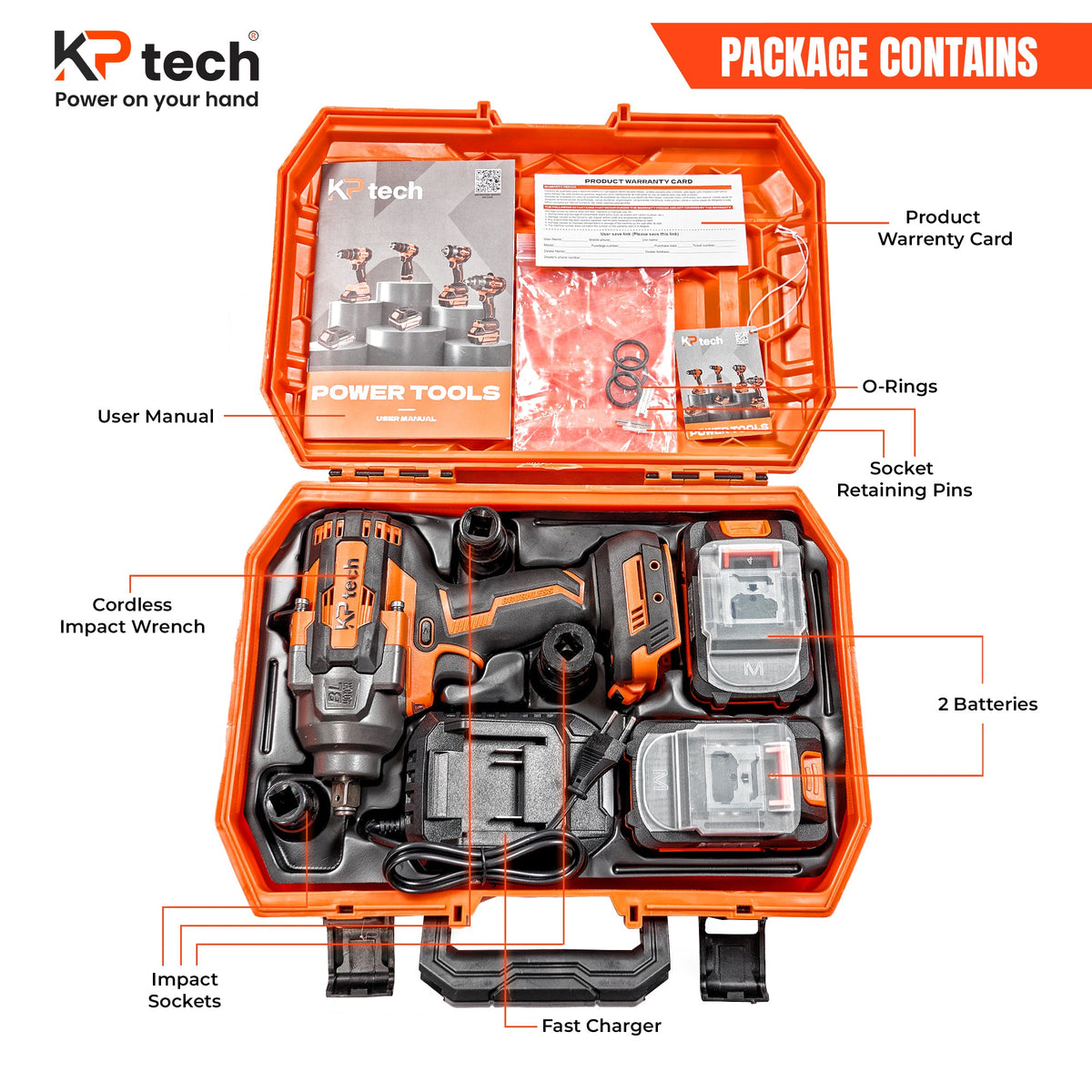 Upgrade to extreme power with the KP TECH Cordless Impact Wrench, built for heavy-duty applications and professional use. With 1000Nm torque, dual batteries, and a brushless motor, it delivers unmatched performance for automotive, construction, and industrial tasks.