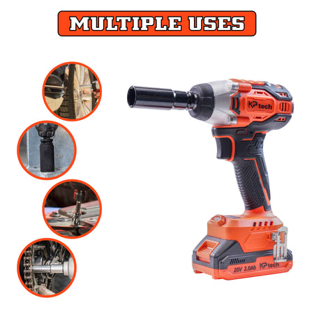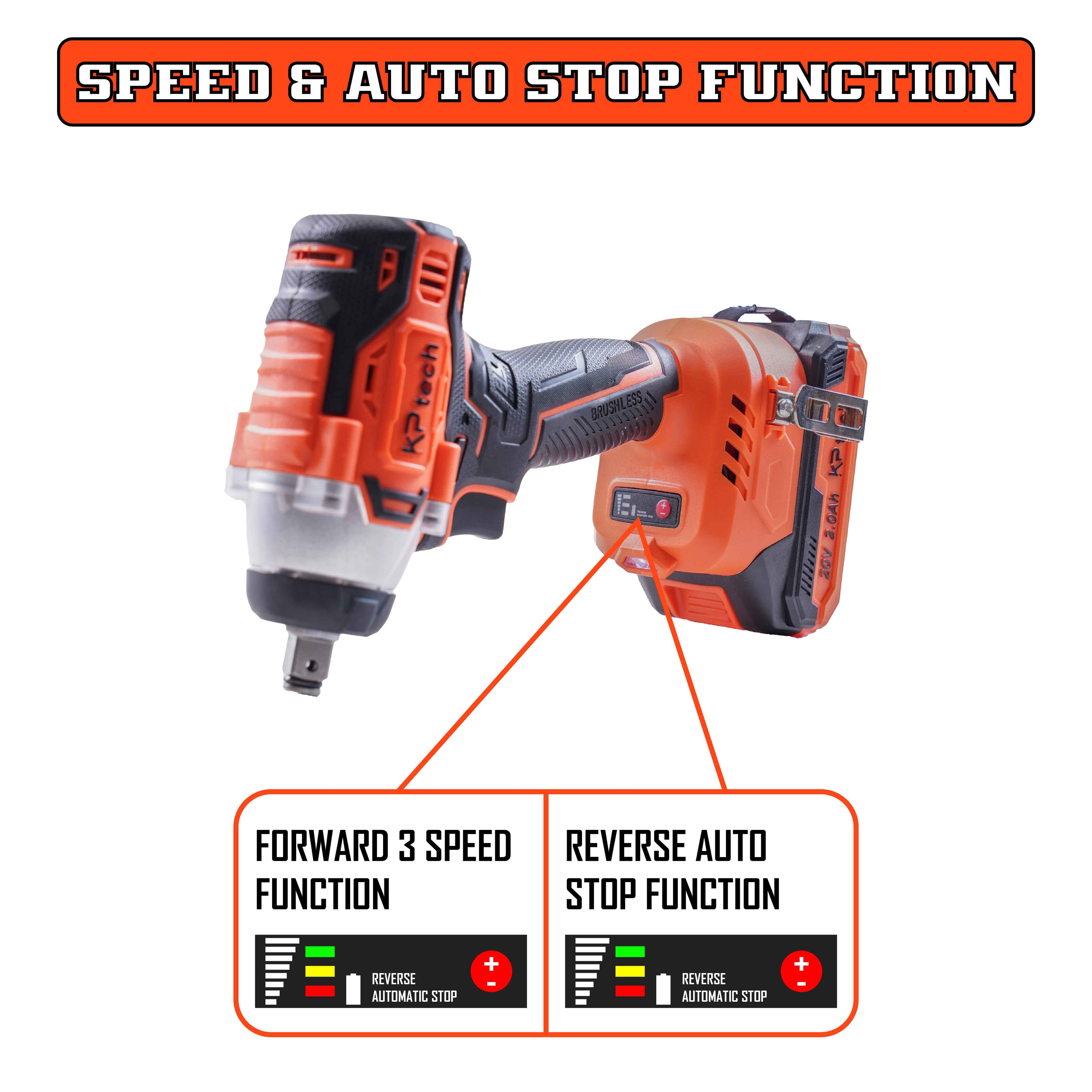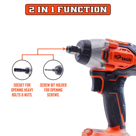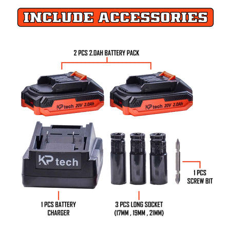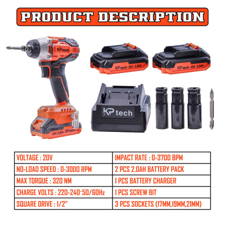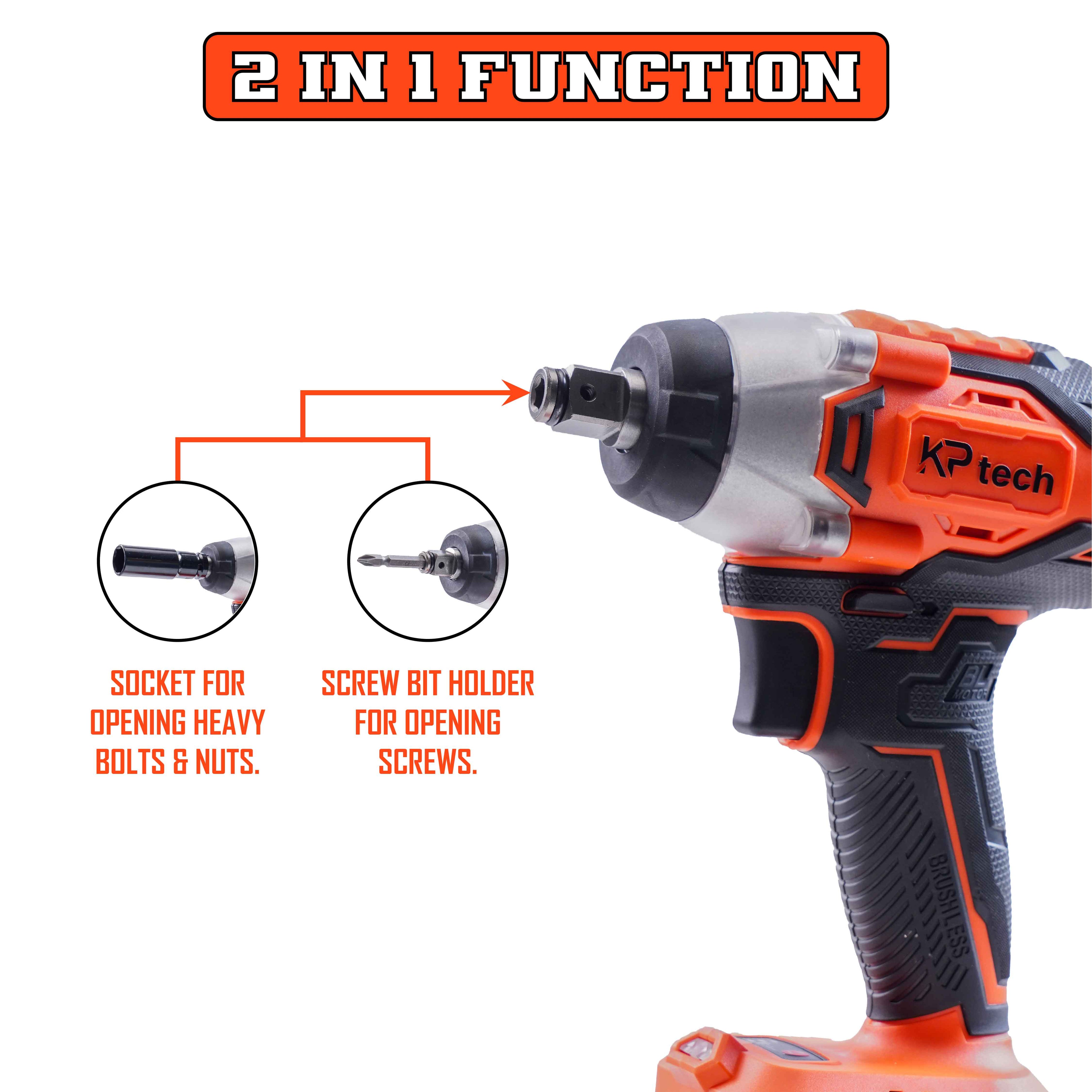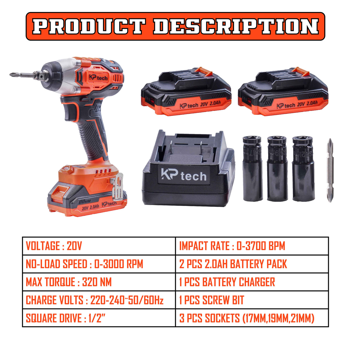 KP tech 20V 2 in 1 Cordless Impact Wrench+Screw Driver, Brushless 320NM Impact Wrench With 3 Speed and Auto Stop Function | 2 Li-Ion Batteries | 1 Charger | 3 Long Socket | 1 Screw bit with BMC box