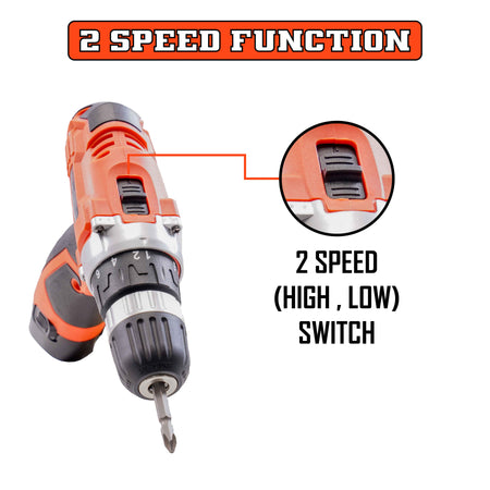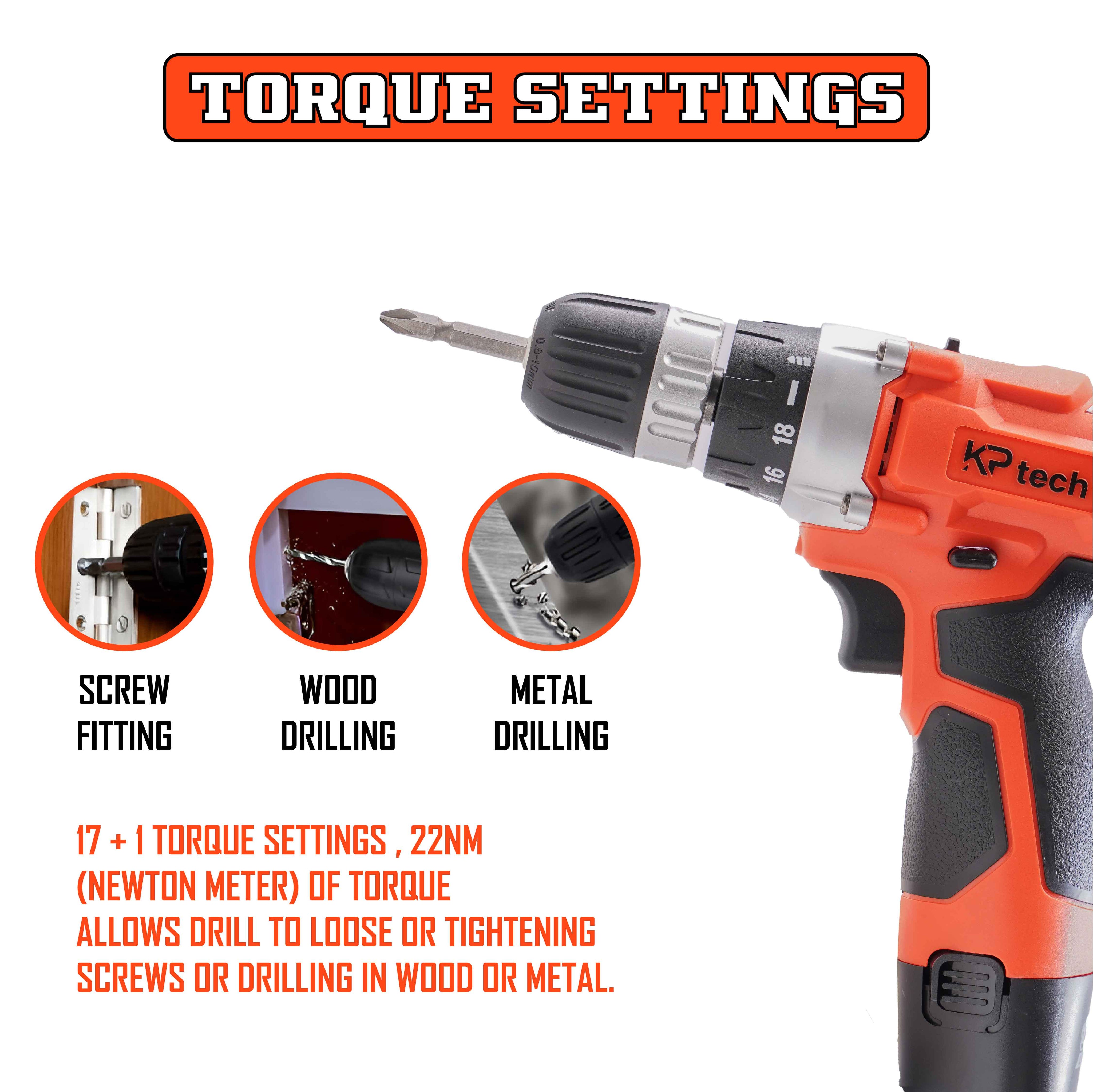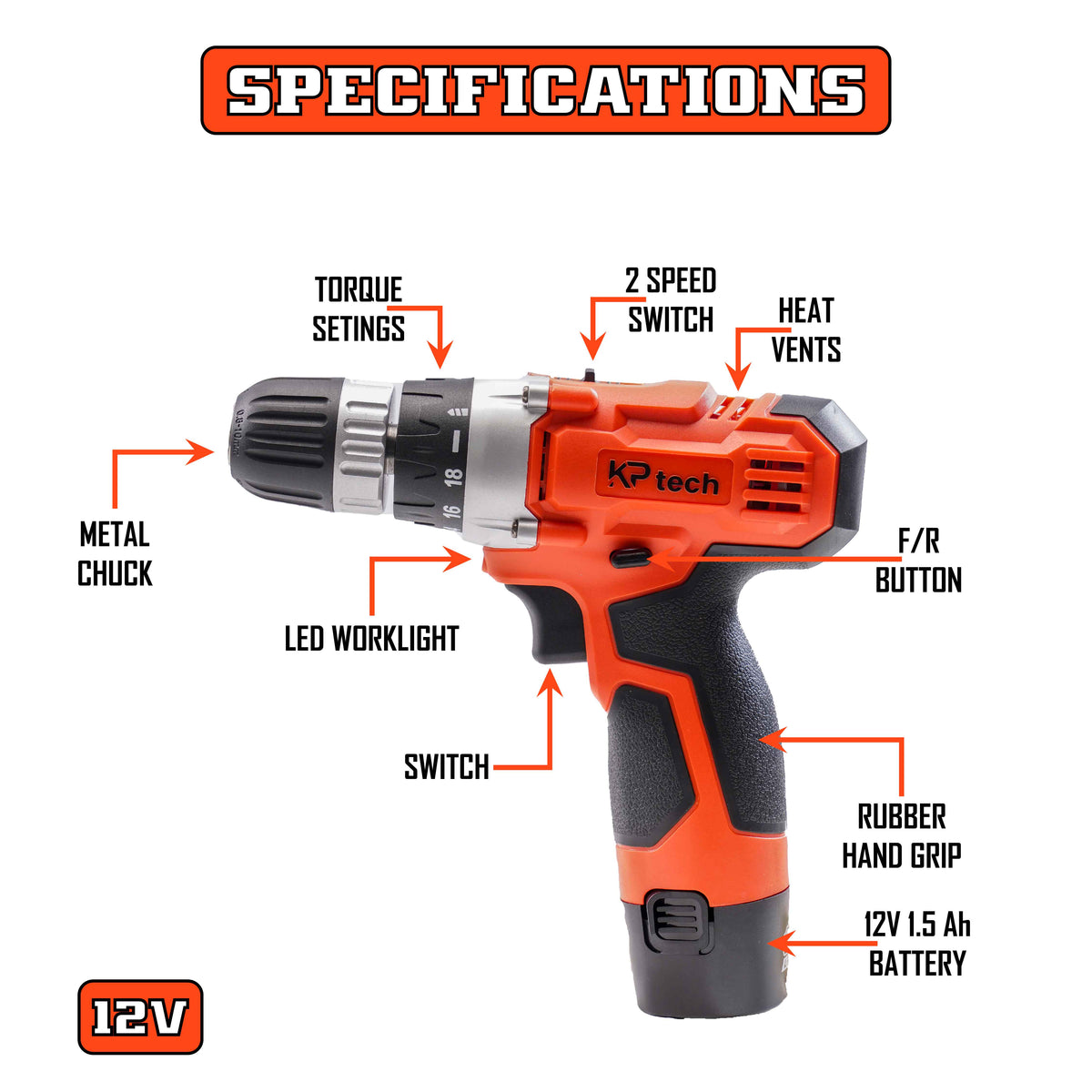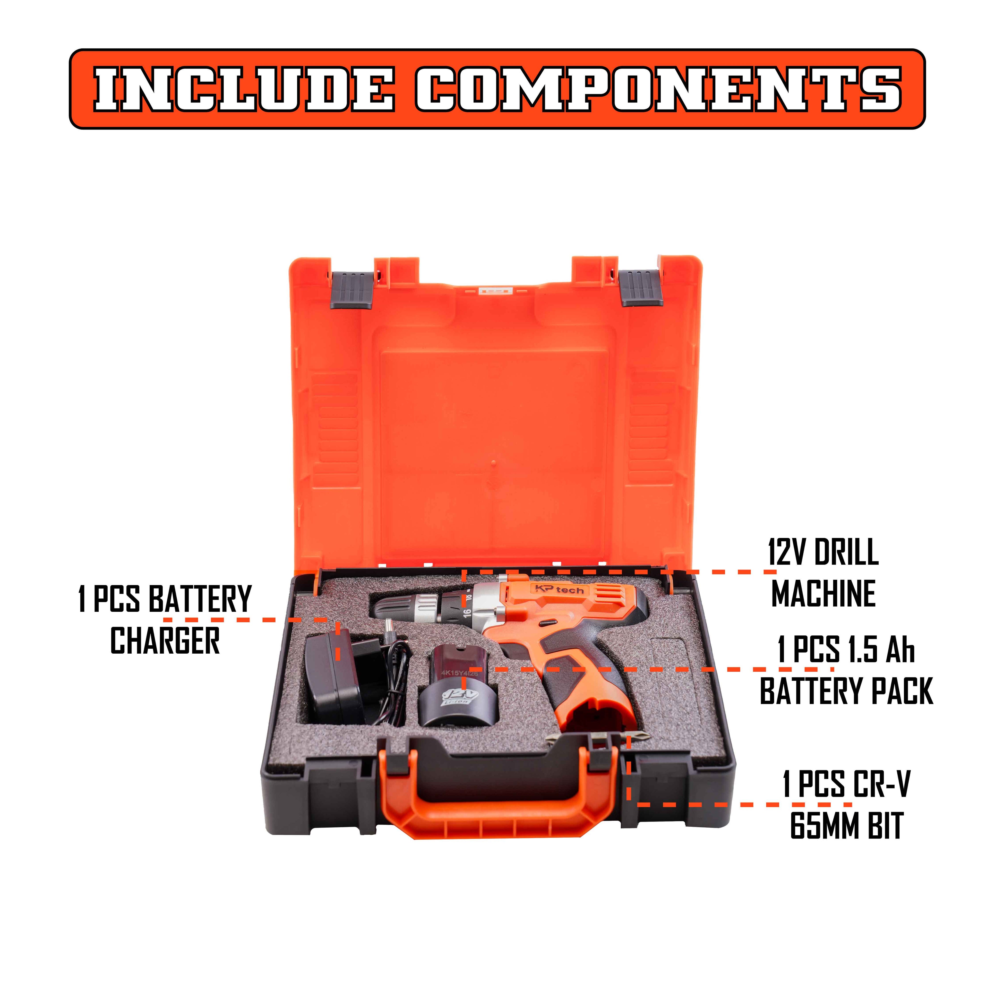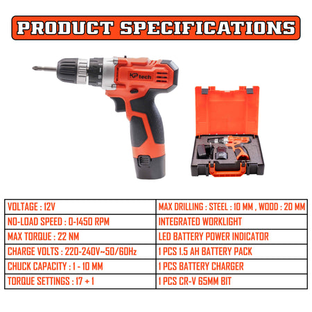 KP Tech Cordless Drill | 12V | 0-1450 RPM Speed | 22NM Max Torque | 1-10MM Chuck Capacity | Integrated Worklight | 1 Pcs 1.5Ah Battery | 1 Pcs Charger | 1 Pcs CR-V 65MM Bit