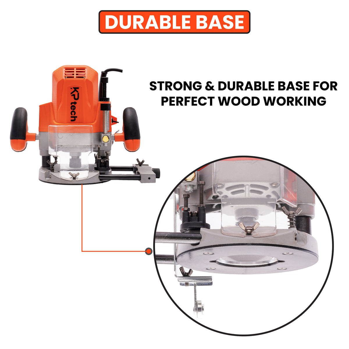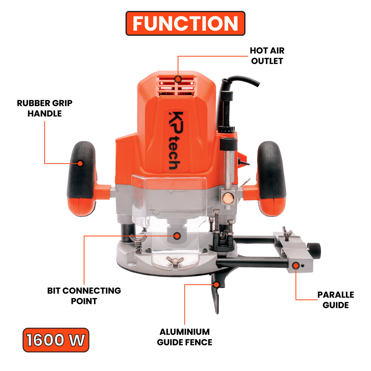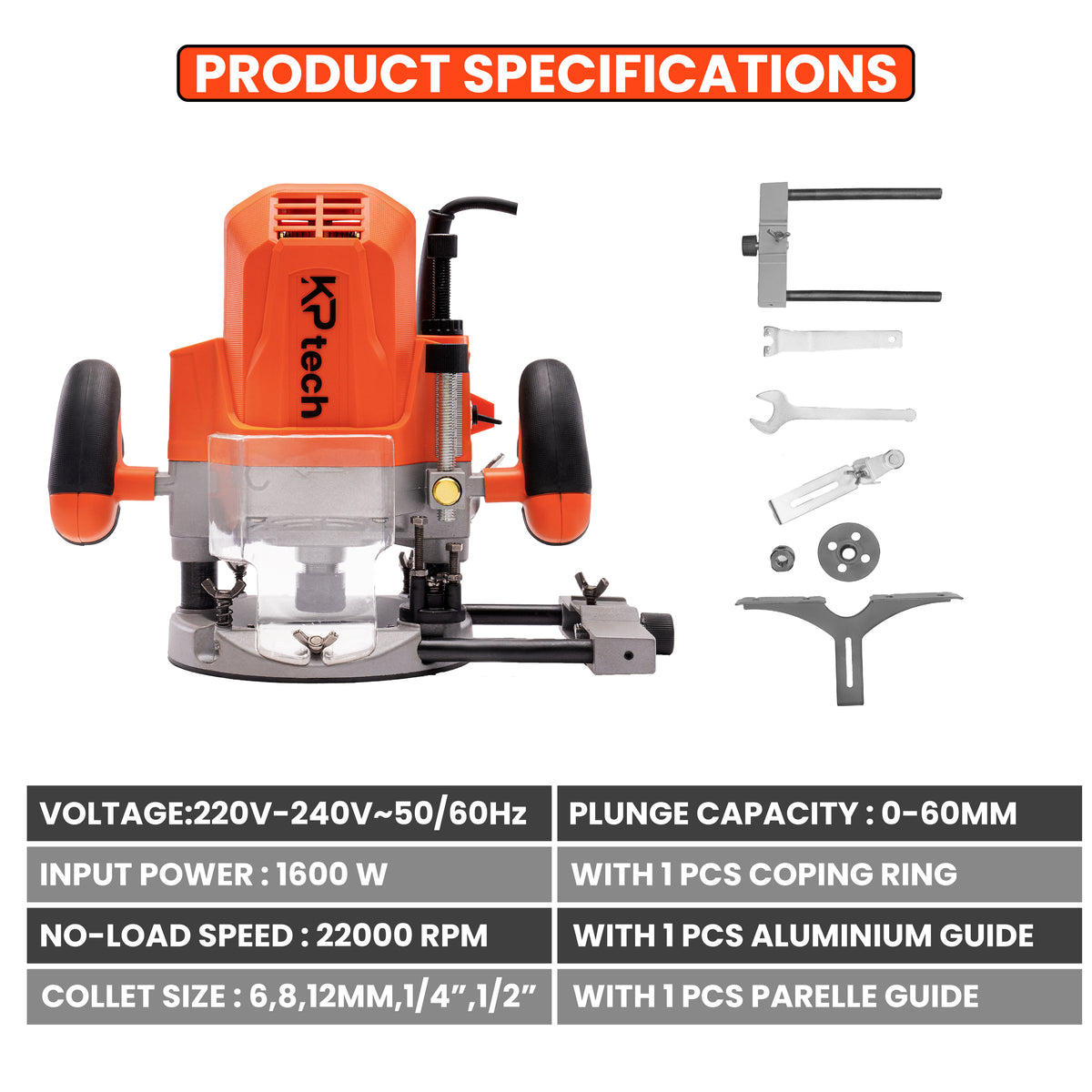 KP Tech Electric router 1600W | 22000 RPM | With coping ring | With aluminium guide fence