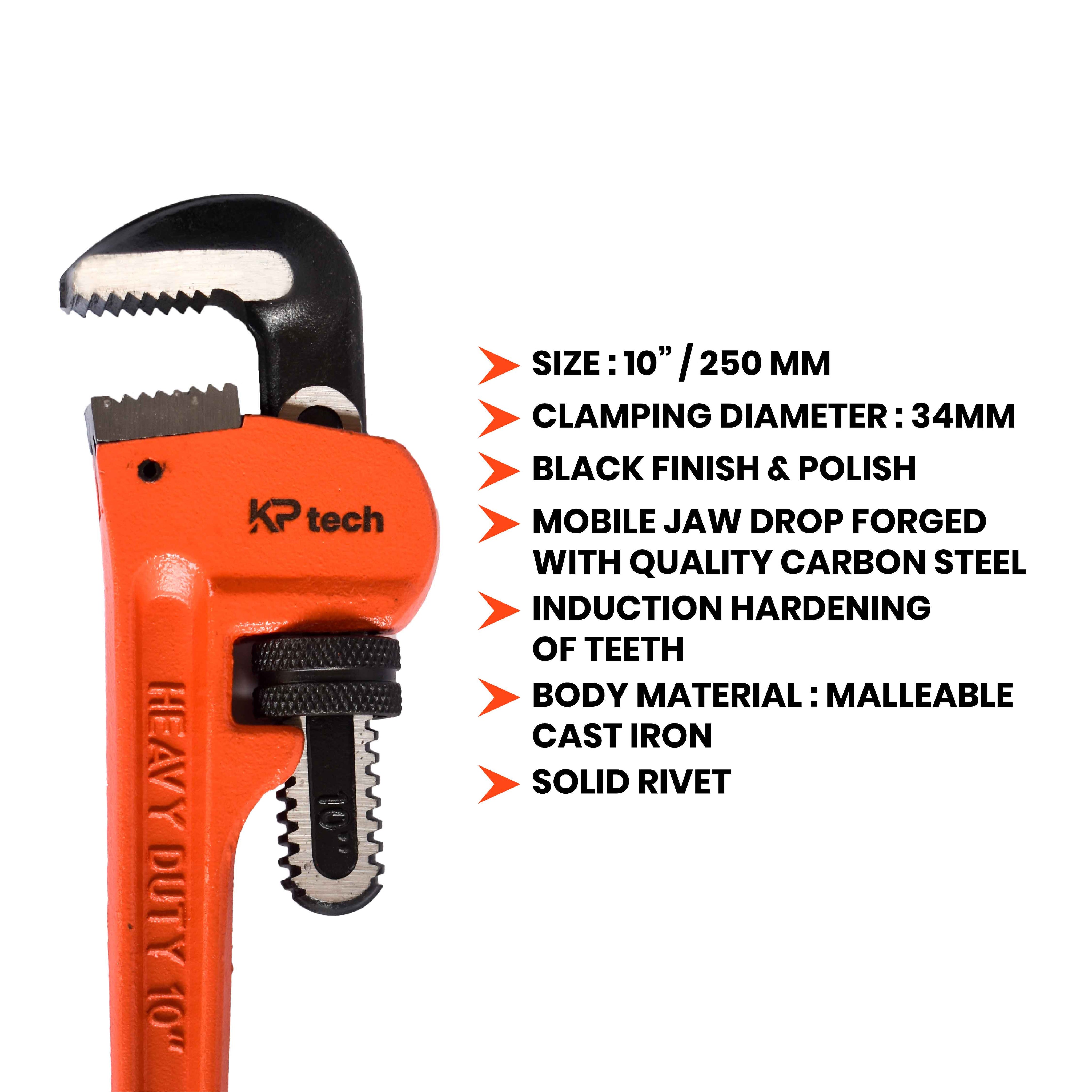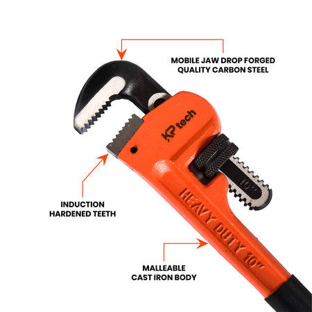 KP Tech Heavy Duty Pipe Wrench - 10 Inch HT-HPW1001 | Strong Jaw Grip | Durable Steel Construction | Ideal for Plumbing & Pipe Fitting