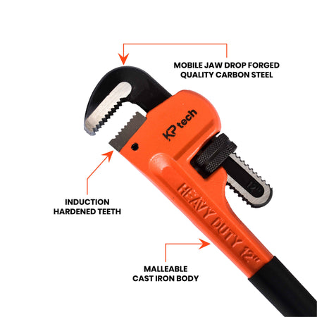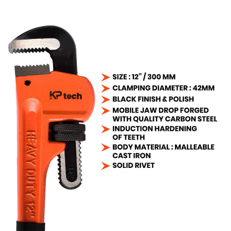 KP Tech Heavy Duty Pipe Wrench - 12 Inch HT-HPW1201 | Strong Jaw Grip | Durable Steel Construction | Ideal for Plumbing & Pipe Fitting