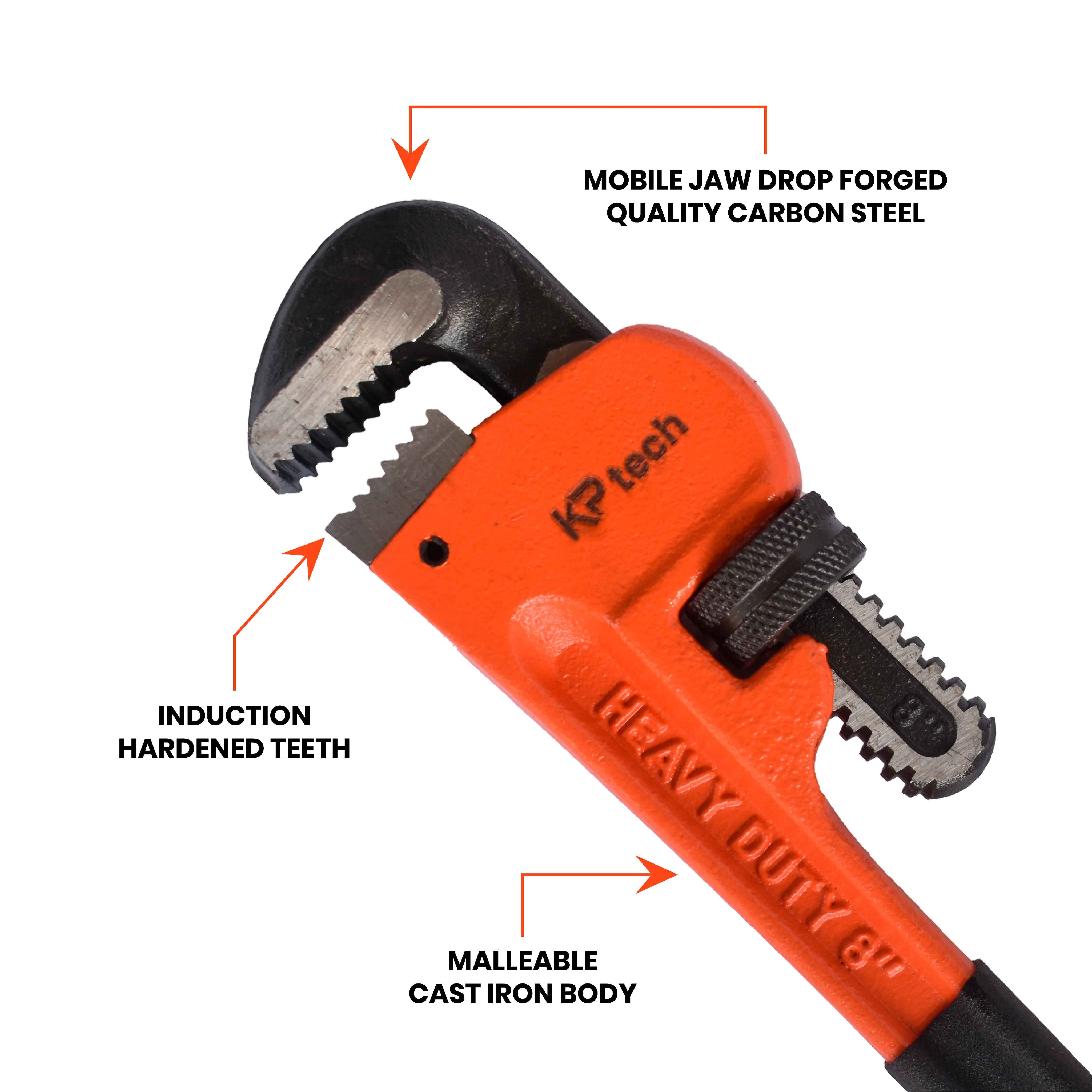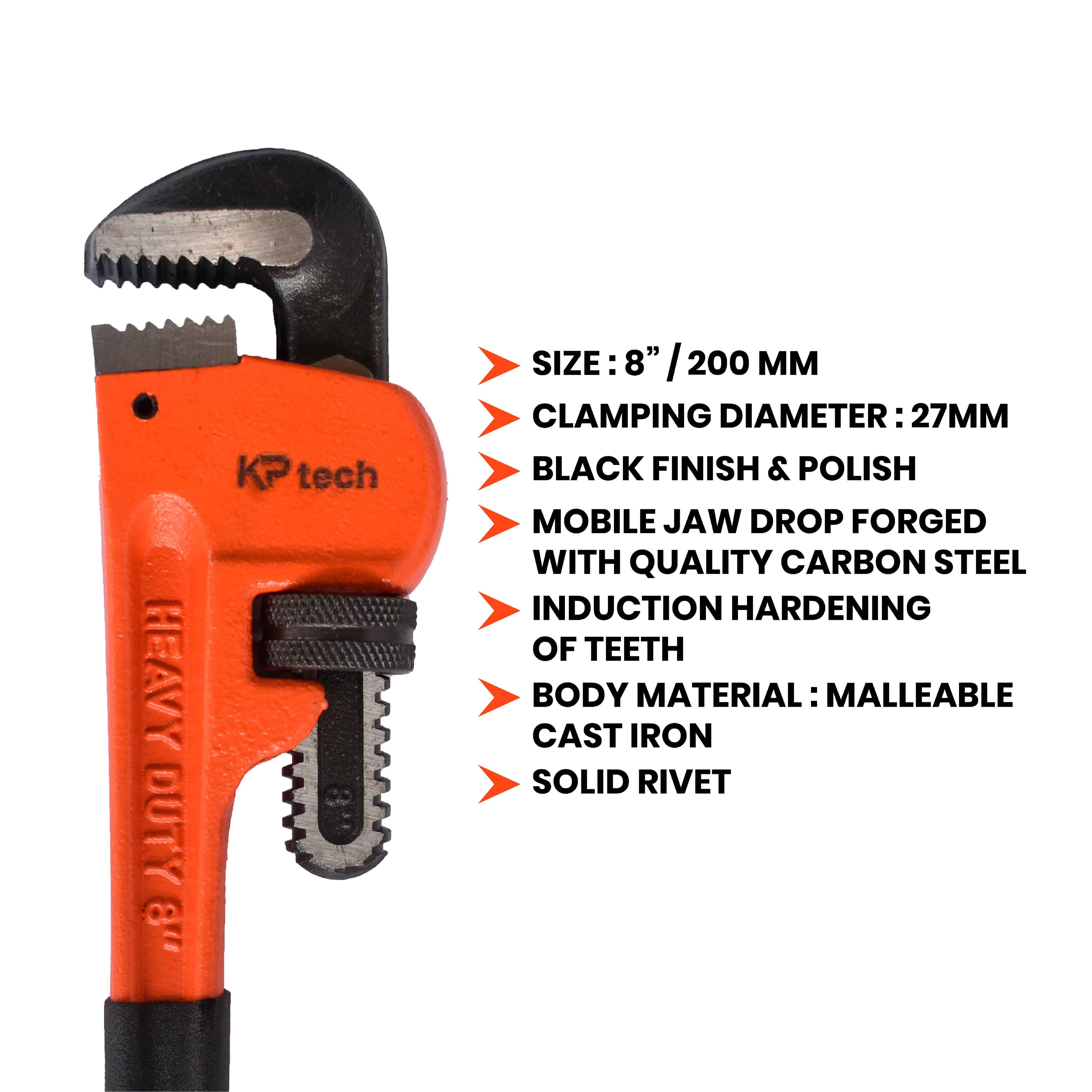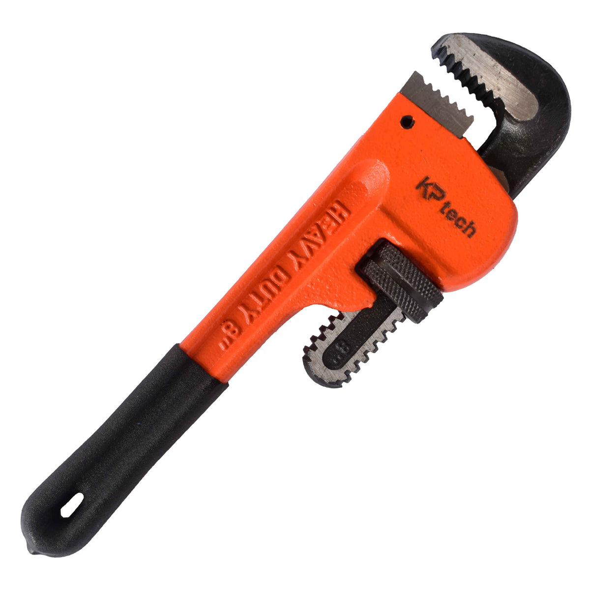 KP Tech Heavy Duty Pipe Wrench - 8 Inch HT-HPW0801 | Strong Jaw Grip | Durable Steel Construction | Ideal for Plumbing & Pipe Fitting