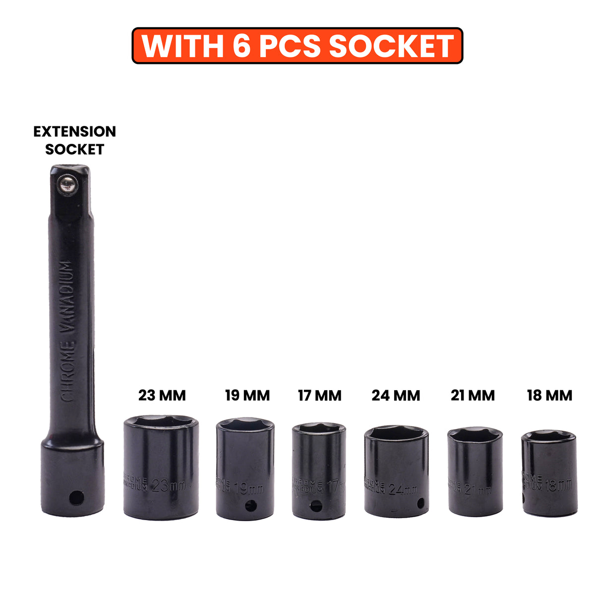 - 6 pcs sockets (17, 18, 19, 21, 23, 24mm) for various fastening needs