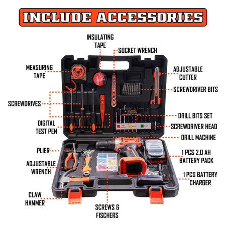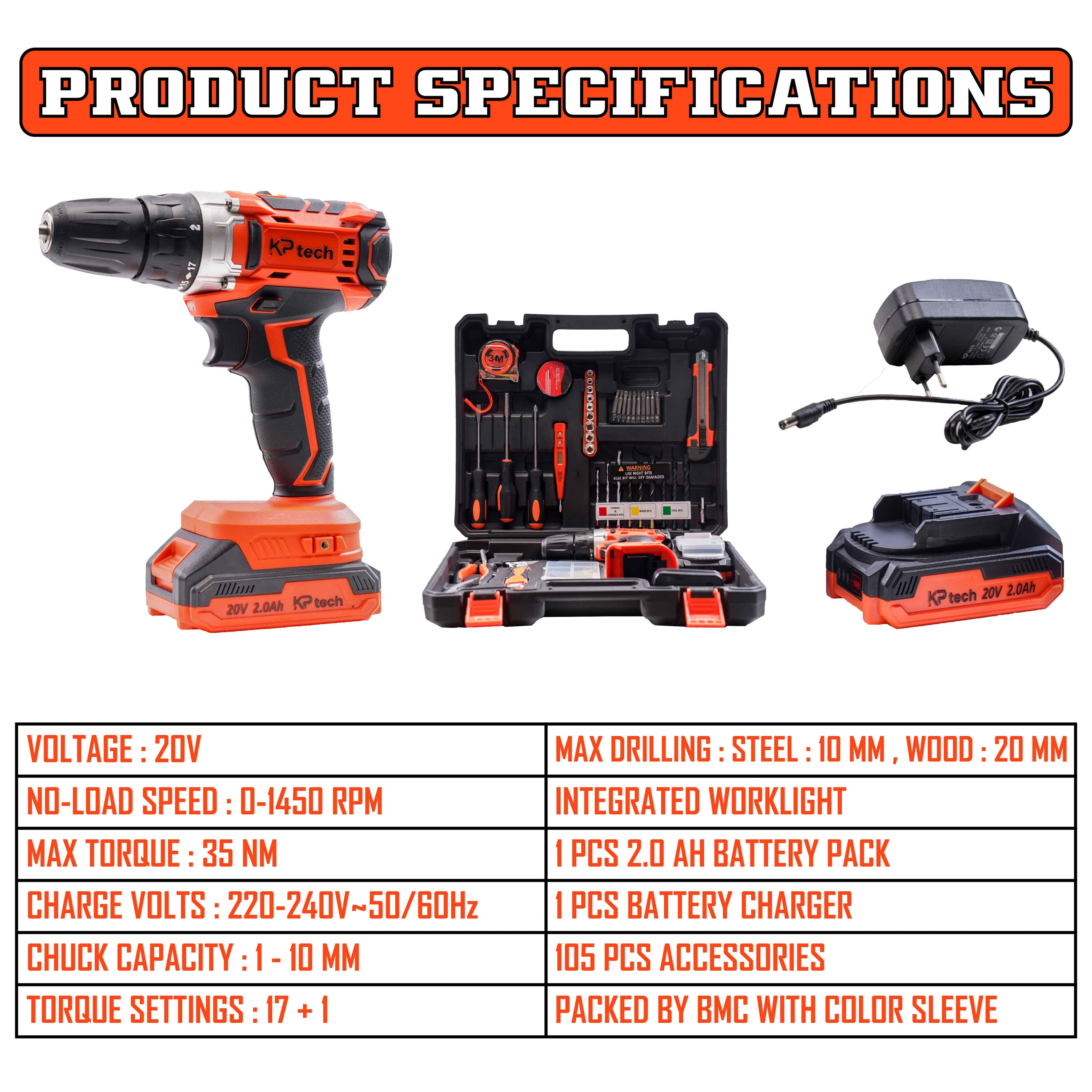 KP Tech Professional Tool Kit with 20V Cordless Impact Drill, 10mm Keyless Chuck|2.0 Ah Battery & Charger| 17+1 Torque Setting | 2 Speed with 35 NM Torque | 105 Pcs Home Essential Tools/Accessories