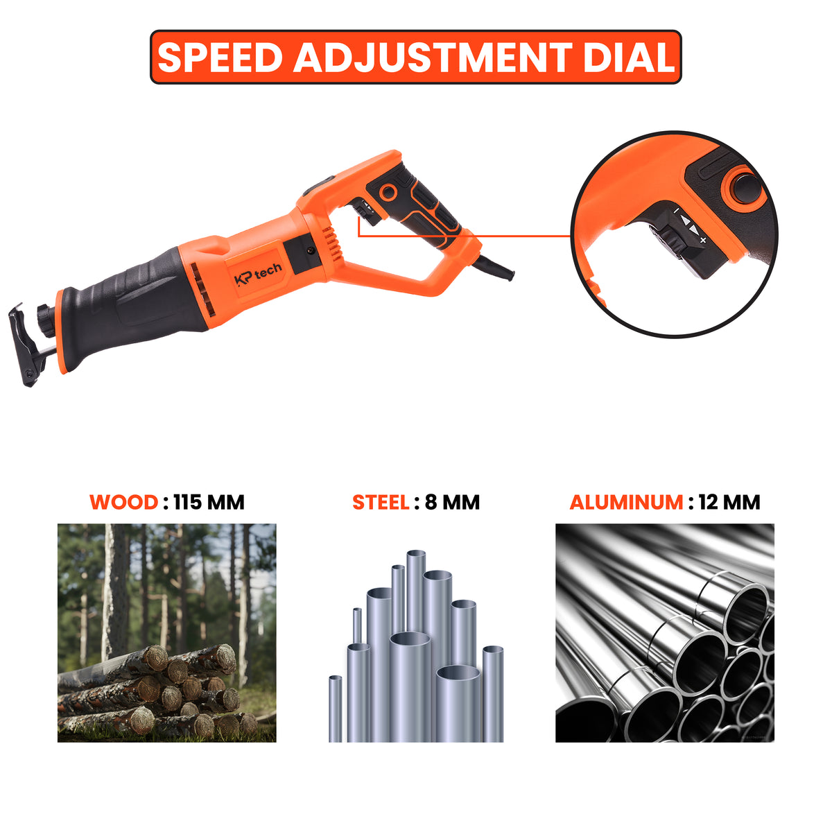KP Tech Reciprocating Saw 800W | 2800rpm | With 1pcs metal saw blade and 1pcs wood saw blade | With rotatable rear handle to suit most cutting