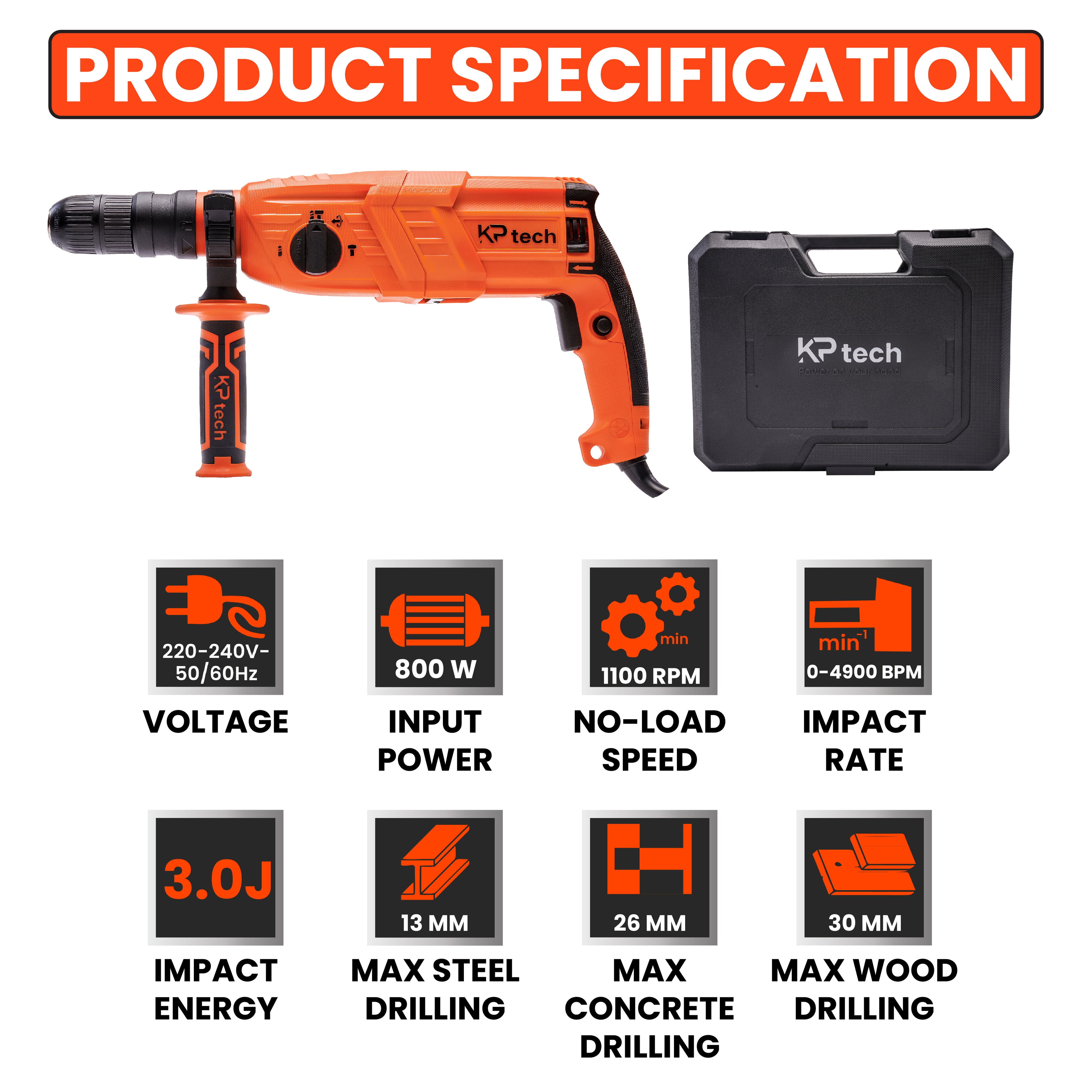 KP Tech Rotary Hammer 800W | 0-1100 RPM