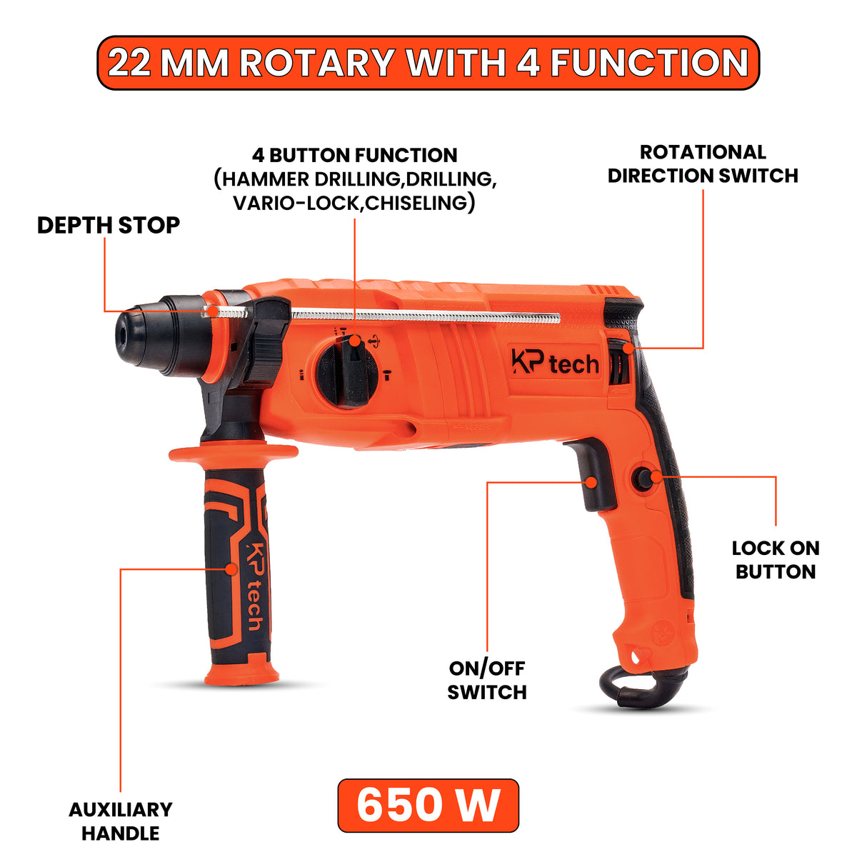 KP Tech Rotary Hammer 650W | 1600 RPM | With 3 SDS-PLUS drills